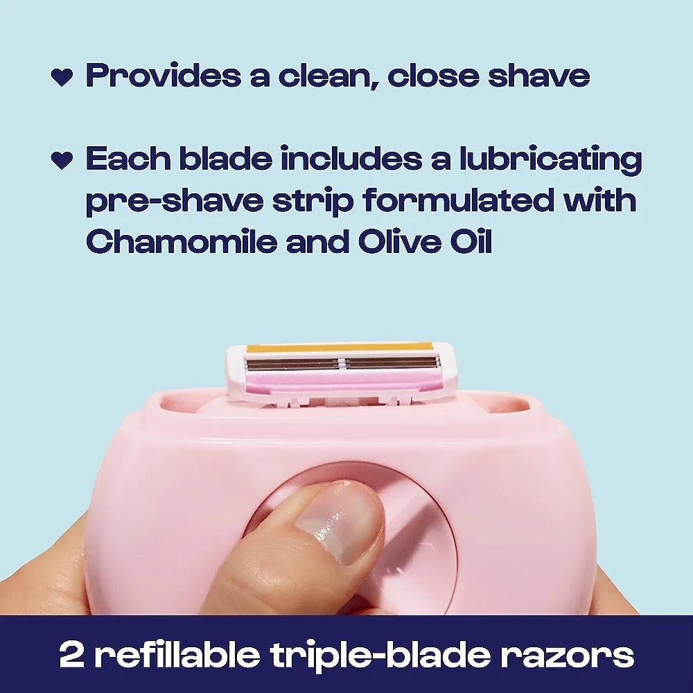- Contains two sharp triple-blade, razor cartridges for a clean, close shave. Each razor cartridge includes a lubricating pre-shave strip formulated with Chamomile and Olive Oil for a soft finish.